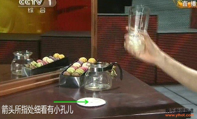 魔术结束后,很快就有网友指出刘谦“镜子里喝咖啡”的魔术有一个漏洞:表演时,镜子上有一条线,一闪一闪的很奇怪,而且刘谦在拿开杯子时托盘上有一个小窟窿,杯中的咖啡也许是从这窟窿中流走的。网友刘先生告诉记者,他曾仔细研究很多遍刘谦喝咖啡时的镜头,发现杯子里咖啡下降的速度和刘谦“断断续续”喝咖啡的过程不一致,“杯子里可能不是咖啡而是一种可以挥发的物质”。记者回看视频时,确实发现刘谦在“镜子中喝咖啡”时曾多次停顿,与咖啡下降的过程有着不一致的现象。而董卿在拿起杯子时,杯子垫上有一个不甚明显的圆状物,也正是网友所疑的“窟窿”。